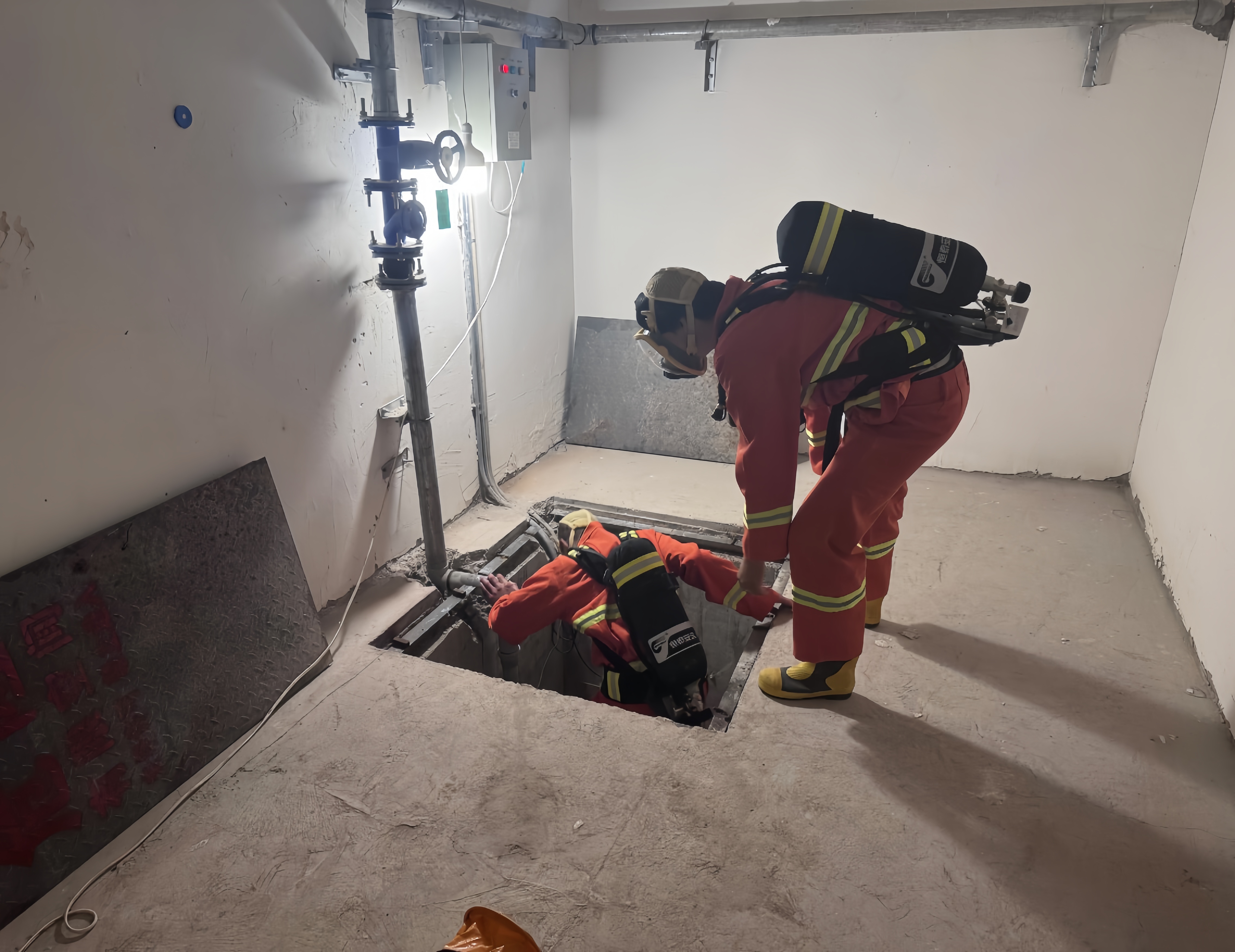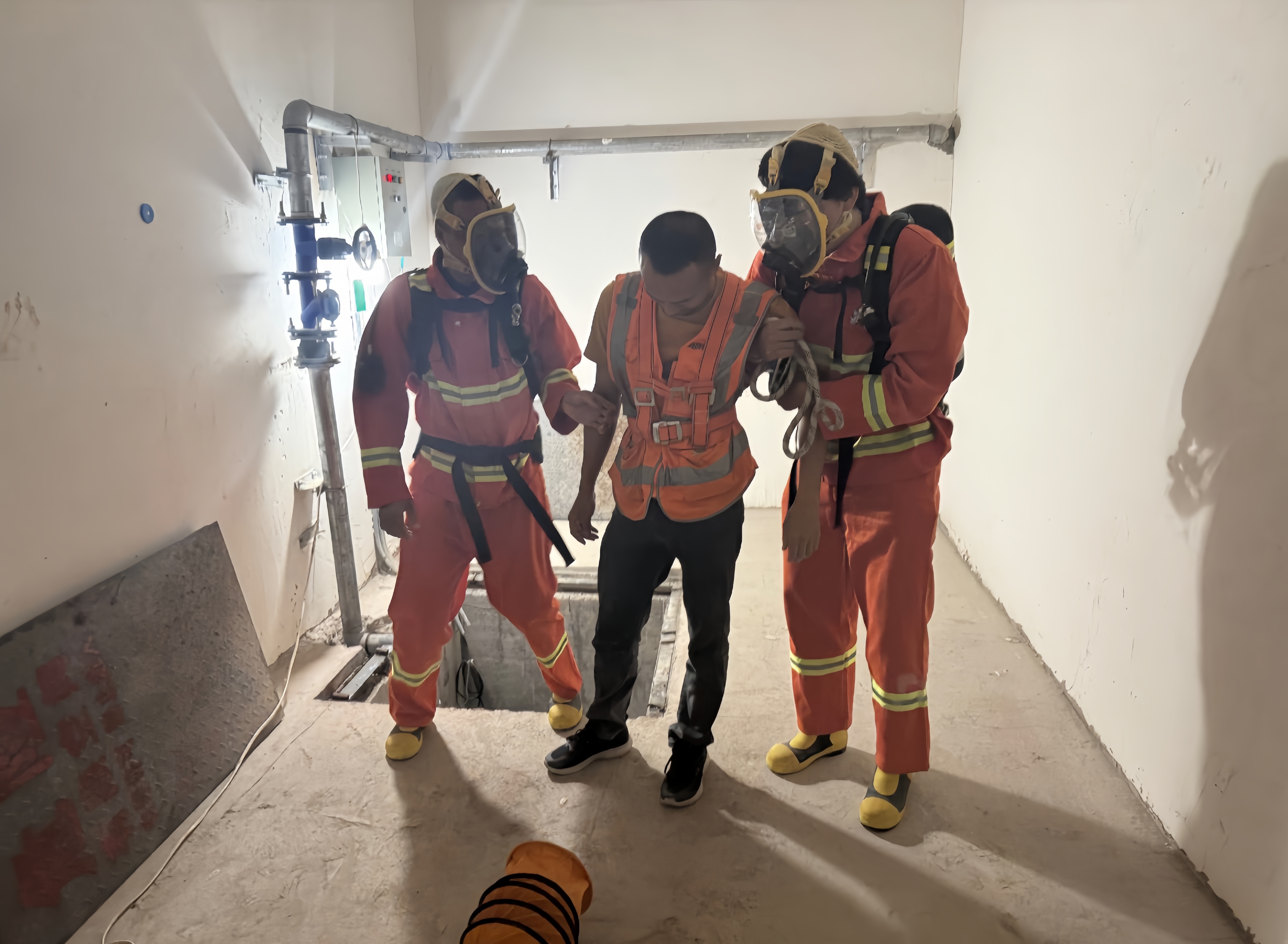 本次演练模拟工程部两名维修人员,在日常巡查中发现厂房污水井的水泵故障,其中一人监护,另外一人未严格执行“先通风、后检测、再作业”的原则,未佩戴防毒面具就使用工程梯下至集水坑底部进行检查,导致吸入过量有害气体,昏倒在坑底,急需救援。