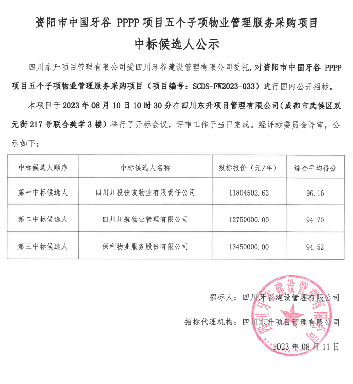 资阳市中国永利23411PPP项目五个子项物业管理服务采购项目中标候选人公示