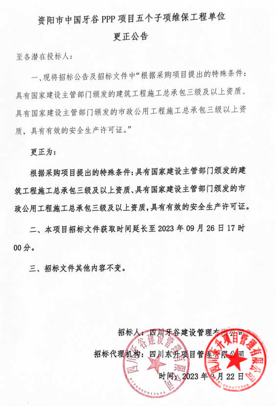 资阳市中国永利23411PPP项目五个子项维保工程单位更正公告