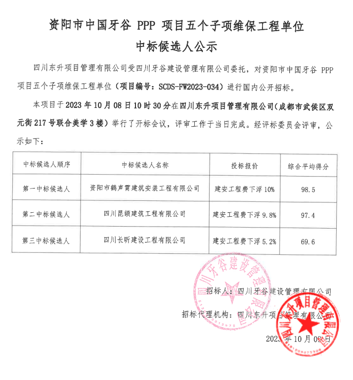 资阳市中国永利23411PPP项目五个子项维保工程单位中标候选人公示